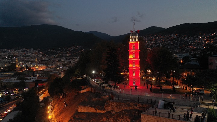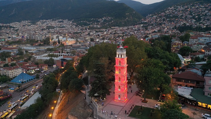 Bursa’nın tarih başkenti kimliğini öne çıkaracak Tarihi Çarşı ve Hanlar Bölgesi, Osman Gazi ve Orhan Gazi Türbeleri, Tarihi Saat Kulesi, Bey Sarayı ve Hisar Bölgesi’ni de içine alan ‘Tarih Adası’ çalışmalarına hız veren Büyükşehir Belediyesi, restorasyonu tamamlanan Saat Kulesini ışıklandırdı, tophane yamaçlarını kirlilikten arındıran çalışmalarda da sona geldi.