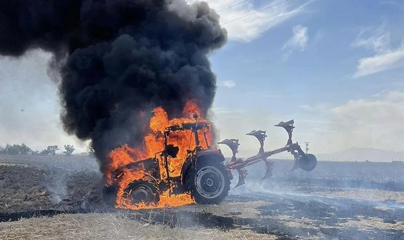 Yangın, öğle saatlerinde merkeze bağlı Göztepe köyü yakınlarında bulunan tarlada meydana geldi. Edinilen bilgiye göre, Hüseyin E., tarlasını sürdüğü traktörü bir anda motor kısmından alev alarak yanmaya başladı. Hüseyin E., yanan traktörünü kendi imkanları ile söndürmeye çalışırken, bir taraftan da itfaiyeden yardım istedi. Olay yerine gelen itfaiye ekibi yanan traktörü kısa sürede söndürdü. Alevlere teslim olan traktör tamamen yanarak demir yığınına döndü. Traktörün neden yandığı araştırılıyor.