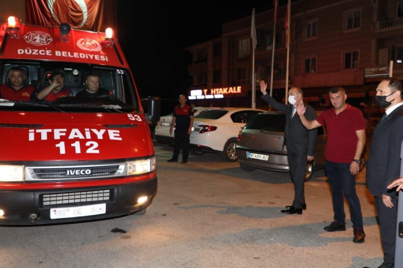 Daha önce Düzce’de yaşanan sel felaketlerinden tecrübe kazanan Düzce Belediyesi İtfaiye Müdürlüğü ekipleri selin yaşandığı Kastamonu’ya Belediye Başkanı Dr. Faruk Özlü tarafından gece saatlerinde uğurlandı.
