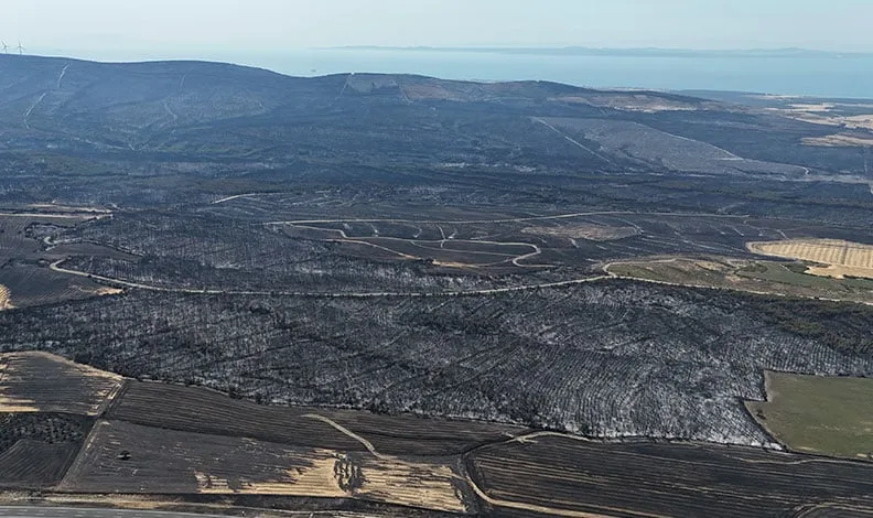 Tekirdağ Şarköy ilçesi Kocaali mevkiinde önceki gün çıkan orman yangını kısa sürede tarım arazilerine ve yerleşim yerlerine sıçradı. Yangın, rüzgarın da etkisiyle Çanakkale’nin Gelibolu ilçesi sınırlarına ulaştı. Yangında Gelibolu ilçesine bağlı Kavakköy’de orman ve tarım arazileri küle döndü. Ekipler yangın alanında çalışmalarını sürdürürken, yangında zarar gören ormanlık alan ve tarım arazileri dronla görüntülendi.