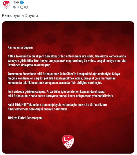 TFF’den konuyla ilgili yapılan açıklamada, “A Milli Takımımızın bu akşam gerçekleştirilen antrenmanı sırasında, televizyon kameralarına yansıyan görüntüler üzerine yorum yapılarak oluşturulmuş bir video, sosyal medya mecraları üzerinden dolaşıma sokulmuştur. Antrenman öncesinde milli futbolcumuz Arda Güler’in kasığındaki ağrı nedeniyle, Çekya maçına kendisini en sağlıklı şekilde hazırlayabilmek adına, bireysel çalışma yapması konusunda teknik heyetimiz ve oyuncu arasında fikir birliğine varılmıştır. İlgili videoda görülen çalışma, Arda Güler için belirlenen kapsamda olmayıp, milli futbolcumuz daha sonra koruyucu amaçlı lineer çalışmasına yönlendirilmiştir. Kalbi Türk Milli Takımı için atan sağduyulu vatandaşlarımızın bu tür içeriklere itibar etmemesi gerektiğini önemle hatırlatırız” denildi.