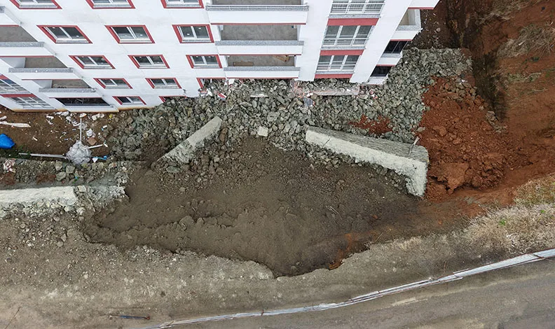 Olay, Yomra ilçesine bağlı Sancak Mahallesi Gümüş Sokak’ta meydana geldi. Edinilen bilgilere göre, yol kenarında bulunan istinat duvarı henüz belirlenemeyen bir nedenle sabah saatlerinde büyük bir gürültüyle çöktü. Çöken duvardan kopan taş ve toprak yığını, bitişiğinde bulunan 9 katlı yeni binanın iki dairesinin duvarını yıktı.