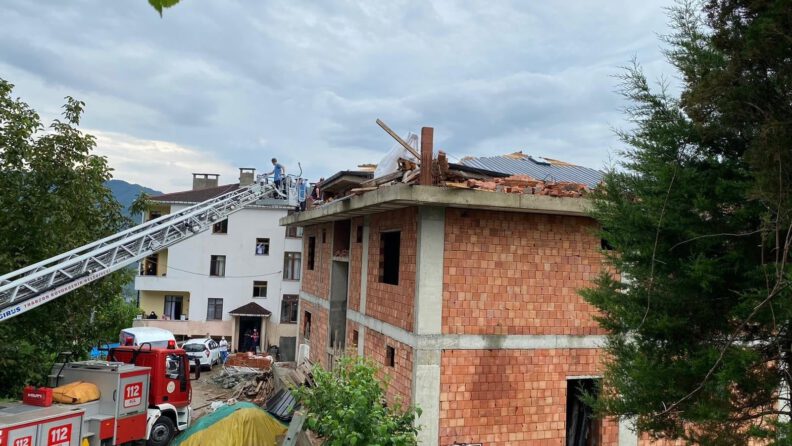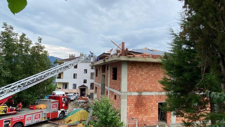 Alınan bilgiye göre, bölgede etkili olan şiddetli sağanak yağış sırasında Trabzon’un Of ilçesinin Ballıca mahallesinde inşaat halindeki 2 katlı bir evin çatısına bugün öğle saatlerinde yıldırım düştü. Yıldırım düşmesi sonucu çatı çökerken, çöken çatının altında 2 inşaat işçisi kaldı. Çevredeki vatandaşların AFAD ve Trabzon Büyükşehir Belediyesi İtfaiye ekiplerine haber vermesi ile kurtarma çalışması başlatılırken, 2 inşaat işçisinin durumlarının ağır olduğu öğrenildi. Bölgeye sağlık ekipleri de çağrılırken, enkaz altındaki işçilere ulaşılmaya çalışılıyor.
