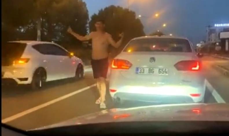 İddiaya göre, Erdemli ilçesi Ayaş yolu üzerinde otomobiliyle seyreden bir şahıs, D-400 Karayolu üzerinde seyir halinde olan ve içerisinde kadın ve çocuğun bulunduğu bir aracı yol boyunca selektör yapıp rahatsız etti. Işıklara geldiğinde yarı çıplak halde aracından inerek küfür ve hareketlerde bulunan şahıs, kadının “Çocuk var” çığlıklarına aldırış etmeden yumrukladığı aracın camına tükürdü. Ailenin, “Seni cep telefonu ile kaydediyorum” sözlerine ise dans ederek karşılık verdi. Kimliği belirsiz sürücü, daha sonra yoluna devam etti.