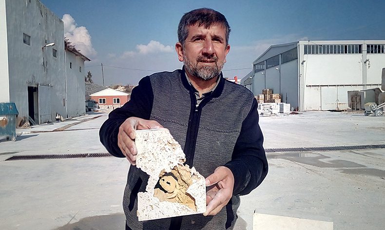 Denizli’de 20 yıl traverten ocaklarında maden mühendisi olarak çalıştıktan sonra 6 yıl önce kendi fabrikasını kuran Süleyman Burkay, traverten blokları kesilirken başında bekliyor. Kesilen traverten blokları içinden çıkan yengeç, yaprak ve kemik fosillerini deposunda saklayan Burkay’ın elinde 30’ a yakın fosil bulunuyor. Burkay’ın koruma altına aldığı fosiller Fransa’dan gelen ilim insanlarının da ilgisini çekti. Fabrikaya gelerek inceleme yapan ilim insanları fosillere numara verip kayıt altına aldı. Fabrikasında Honaz ilçesine bağlı Kaklık Mahallesi sınırları içinde bulunan Ballık Boğazı Mevkii’nden çıkartılan traverten bloklarını kesip ebatladıklarını anlatan Maden Mühendisi Burkay, yılda 15 bin tona yakın traverten kesimi yaptıklarına dikkat çekti.