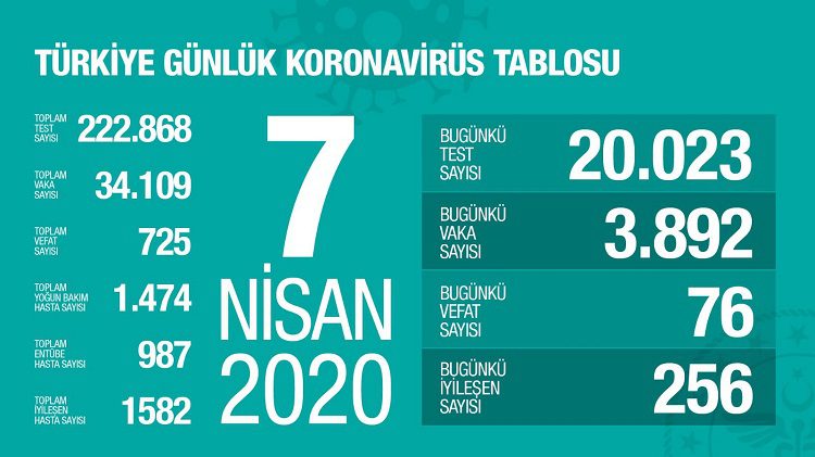 Son 24 saate yapılan 20 bin 023 testten 3 bin 892 kişiye covid-19 tanısı kondu. Bugüne kadar Türkiye’de toplam 222 bin 868 test yapıldı. Toplam vaka sayısı 34 bin 109 kişiye ulaştı.