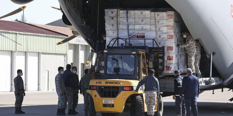 Sağlık Bakanlığı tarafından hazırlanan maske, N95 maske ve tulumdan oluşan yardım malzemeleri, Etimesgut Askeri Havaalanı’ndan A400M tipi kargo uçağına yüklenerek yola çıktı.