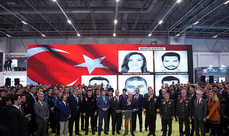Türk Havacılık ve Uzay Sanayii Anonim Şirketi’nin (TUSAŞ) dün Ankara’nın Kahramankazan ilçesindeki tesislerine yönelik terör saldırısı gerçekleştirilmişti. Saldırıda TUSAŞ’da kalite kontrol görevlisi olarak görev yapan Cengiz Çoşkun, Makine Mühendisi Zahide Güçlü, TUSAŞ çalışanı Hasan Hüseyin Canbaz, Güvenlik görevlisi Atakan Şahin Erdoğan ile taksi şoförü Murat Aslan şehit olmuştu. Bugün Uluslararası Savunma, Havacılık ve Uzay Sanayi Fuarı SAHA EXPO’da TUSAŞ standına dev platform kurularak şehitlerin fotoğrafları yansıtıldı. Ayrıca fuar alanında bulunan led akranlara da Türk bayrakları konuldu.