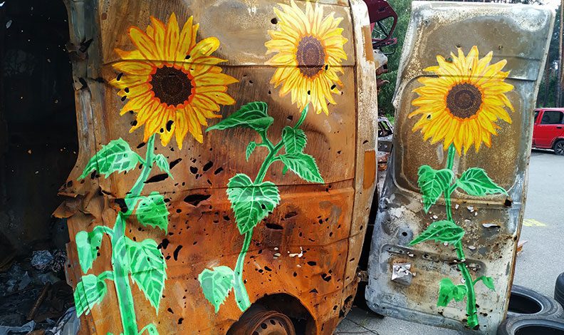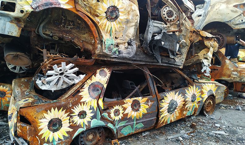 Rusya-Ukrayna savaşı devam ederken, Ukrayna ordusu tarafından ülkenin Irpin şehrinde Rus tanklarının ilerlemesini durdurmak için yıkılan bir köprüden çekilen araçlar, ABD’li ve Ukraynalı sanatçıların tuvali oldu. Sanatçılar hurdaya dönen araçlara çizdikleri ayçiçeği çalışmalarının dijital görüntülerini NFT olarak satışa sunmayı planladıklarını ve elde edilecek gelirin yeni projeler için kullanılacağını belirtti.