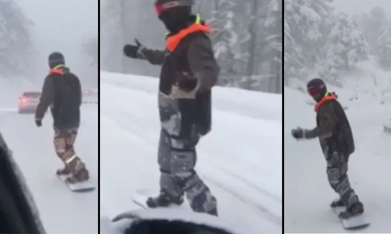 Kış turizminin en gözde tatil merkezlerinden biri olan Uludağ, eksi 11 derece soğukluğa rağmen tatilcilerin akınına uğradı. Yarıyıl tatilinin son hafta sonunu, Uludağ’da kayak yaparak geçirmek isteyen tatilciler trafikte ise uzun kuyruklar oluşturdu. Trafik olduğunu gören bir vatandaş ise snowboard yaparak indi. O anlar trafikteki bir vatandaşın cep telefon kamerasına yansıdı.