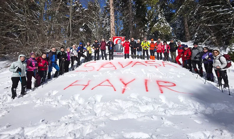 Kulüp üyeleri ve katılımcılar, dünyada yaşanan savaş ve çatışmalara dikkat çekmek amacıyla anlamlı bir mesaj verdi. Beyaz kar örtüsü üzerine büyük harflerle ‘Savaşa hayır’ yazan doğaseverler, sporun barışçıl ve birleştirici gücünü bir kez daha ortaya koydu.