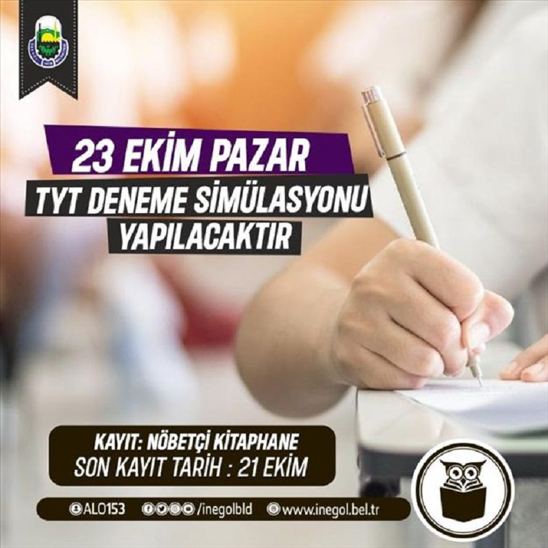 İnegöl Belediyesi’nin hayata geçirdiği Nöbetçi Kitaphaneler, öğrencilerin uğrak mekanı haline geldi. yeni nesil kütüphane formatında yüzlerce öğrenciye hizmet veren 3 ayrı nöbetçi kitaphanede, zaman zaman sınvlara yönelik simülasyonlar da gerçekleştiriliyor. Bunlardan biri de 23 Ekim Pazar günü yapılacak. TYT Deneme Simülasyonuna katılmak isteyen öğrenciler için başvuruların başladığı duyuruldu.