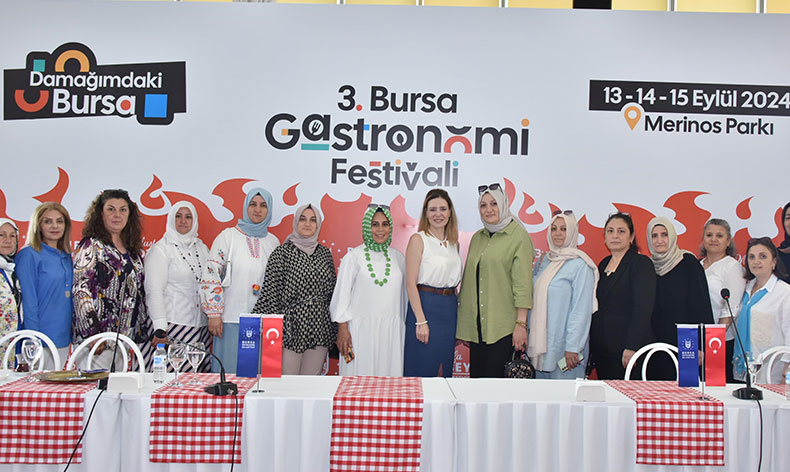 Bursa Büyükşehir Belediyesi tarafından 13-14-15 Eylül tarihlerinde Merinos Parkı’nda düzenlenecek olan 3. Bursa Gastronomi Festivali’nin heyecanı tüm kenti sardı. Bir yandan Gastronomi Tırı 17 ilçeyi gezerek Bursa’nın kendine özgü lezzetleri tanıtılırken, bir yandan da festivalin hazırlıkları tüm hızıyla sürüyor. Pek çok yeniliğin Bursalılarla buluşturacağı festivalde, üretim ve satış yapma kapasitesini elde etmiş kadın kuruluşlarını desteklemek amacıyla ‘Bursa üreten kadınlar sokağı’ da oluşturulacak. Festival öncesinde Bursa Büyükşehir Belediyesi ve 41 kadın kuruluşu arasında düzenlenen törenle sözleşme imzalandı. Merinos Atatürk Kongre Kültür Merkezi’ndeki programa, Bursa Büyükşehir Belediye Başkanı Mustafa Bozbey’in eşi Seden Bozbey, Büyükşehir Belediyesi Genel Sekreter Yardımcısı Mehmet Yıldız, Dış İlişkiler Dairesi Başkanı Pınar Işıkyıldız, Kültür AŞ Genel Müdürü Yankı İçöz, belediye bürokratları, kadın dernekleri ve kooperatiflerinin üyeleri katıldı.
