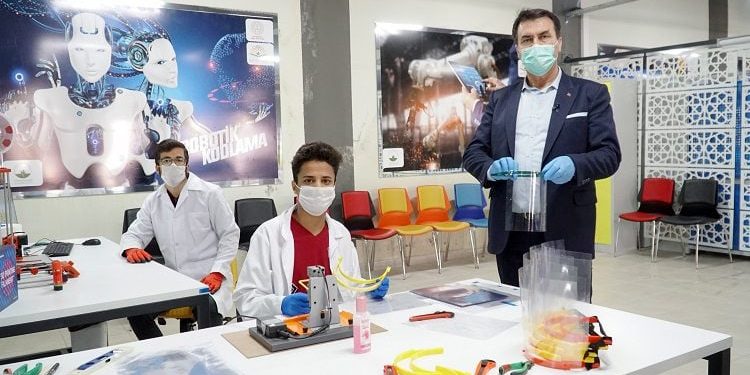1 Milyon nüfuslu Osmangazi İlçesi’ne en büyük eğitim yatırımlarından Uluslararası Murad Hüdavendigar Anadolu İmam Hatip Lisesi’ni kazandıran Osmangazi Belediye Başkanı Mustafa Dündar, öğrencileri ziyaret ederek hem moral verdi hem de teşekkür etti. Öğrencilerin sabah uzaktan eğitimle derslerini yaptıklarını belirten Başkan Mustafa Dündar, “Öğleden sonra da Teknoloji Üretim Merkezi’nde tam gün Sağlık İl Müdürlüğü’müzün talebi üzerine siperlikli maske, maske aparatı ve solunum yolunda kullanılan aparat üretiyorlar” dedi.