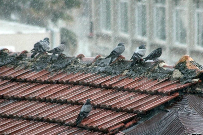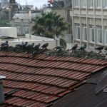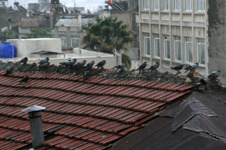 Kilis’te öğleden sonra aniden bastıran sağanak yağmur nedeniyle bir iş yerinin çatısında bulunan yabani güvercinler, şimşekler ve sağanak yağmura rağmen korunaklı yerlere gitmek yerine sağanak yağmur altında ıslanmayı tercih etti. Kanatlarını açarak yağmur altında adeta banyo yapan güvercinler kameraya yansıdı. Kuşlar, yağmur dindikten sonra çatıdan ayrıldı.