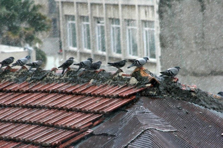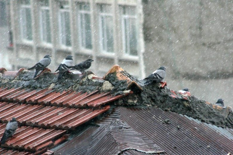 Kilis’te evlerin çatılarına tüneyen ve yağmur altında adeta banyo yapan güvercinlerin o anları görüntülendi.