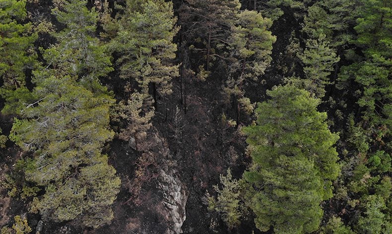 Yangın hasarı da gün ışığıyla ortaya çıktı. Günün ağrımasıyla gece alevlerin yükseldiği bölgelerde yanan orman havadan görüntülendi.