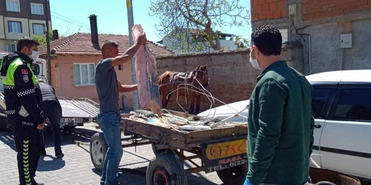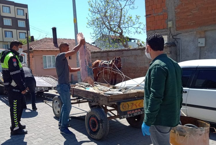 Dışarı çıkış izni bulunmayan ve fırın-eczane gibi yerlerde görevli olmayanlara yönelik denetimler sürüyor. Yasağın başlamasıyla birlikte Mustafakemalpaşa’da bir ihbarı değerlendiren emniyet ekipleri, at arabasıyla hurda toplayan G.B. hakkında işlem yaptı.
