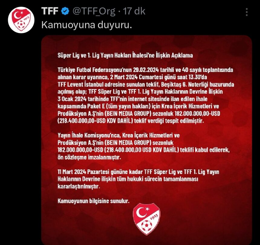 “Türkiye Futbol Federasyonu’nun 29.02.2024 tarihli ve 40 sayılı toplantısında alınan karar uyarınca, 2 Mart 2024 Cumartesi günü saat 13.30’da TFF Levent İstanbul adresine sunulan teklif, Beşiktaş 6. Noterliği huzurunda açılmış olup; TFF Süper Lig ve TFF 1. Lig Yayın Haklarının Devrine İlişkin 3 Ocak 2024 tarihinde TFF’nin internet sitesinde ilan edilen ihale kapsamında Paket E (tüm yayın hakları) için Krea İçerik Hizmetleri ve Prodüksiyon A.Ş’nin (BEIN MEDIA GROUP) sezonluk 182.000.000,00-USD (218.400.000,00-USD KDV DAHİL) teklif verdiği tespit edilmiştir.