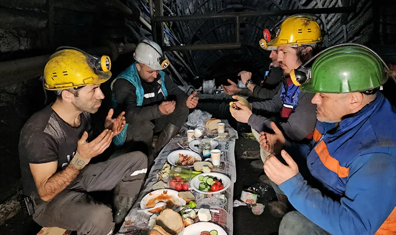 “Yeraltı dediğimiz zaman çok farklı bir olay. Dışarıdaki işlerle kıyasladığımızda tamamen cesaret isteyen ağır işe kendini adapte eden özverisini vermekle gerekli bir iştir. Yer üstündeki işlerle çok farklı. Oraya girdiğinizde her şey ile bağınızı kesiyorsunuz. 120 metre yer altına inince, şartlar ağır. Kısa süreliğine her şeyi unutuyoruz. Ailemizi bile geride bırakıyoruz. Bir Ramazan ayına daha ulaştık. Arkadaşlarla birlikte ilk sahurumuzu yaptık. Herkes evinden getirmiş olduğu yolluklarla sahurumuzu eda ettik. İlk sahurumuzu arkadaşlarla birlikte yaptık. Herkese hayırlı olmasını temenni ediyorum. Ailemiz ön planda oluyor ama buradaki iş ortamında arkadaşlarımız da bizim bir ailemiz oluyor. Destek olabiliyoruz birbirimize. Buruk oluyor. Evde yapmak tabii ki farklı oluyor. Ekmek paramızın peşinde olduğumuz için ailemizin geçimini sağlamak için bu şartları kabul ediyoruz. Sofrada peynir, zeytin, barbunya, soğan, domates, salatalık, içecek su vardı. Sahurumuzu yaptık, duamızı yaptık. Tekrar işimize kaldığımız yerden devam edeceğiz. Hayırlısıyla iftarımızı ailemizle yapacağız. Herkesin içine girmiş olduğu Ramazan ayının hayırlı uğurlu olmasını temenni ediyorum. Ramazan Bayramı’na herkesin ulaşmasını canı gönülden temenni ediyorum. Hayırlı sahurlar.”