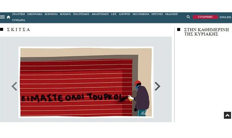 Dün Fransız Charlie Hebdo dergisi, binlerce insanın hayatını kaybettiği merkez üssü Kahramanmaraş olan Türkiye’nin 10 ilini yıkan 7.7 ve 7.6 şiddetindeki binlerce insanın öldüğü on binlerce insanın da yaralandığı depremlerle alay etmişti. Derginin yayınladığı karikatürde yıkık binalar çizilmiş ve üzerine “Tank yollamaya bile gerek yok” yazmıştı. Bugün Yunanistan’ın önde gelen gazetelerinden Kathimerini gazetesinde yayınlanan bir karikatür adeta Fransız dergisine cevap niteliğindeydi. Karikatürde bir grafiticinin duvara Yunanca olarak “ Hepimiz Türküz” yazdığı resmedildi.