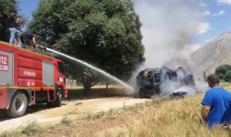 Kahramanmaraş’ın Elbistan ilçesine bağlı kırsal İğde Mahallesi’nde, tarlada yapılan hasadın ardından römorka yüklen saman balyaları henüz belirlenemeyen bir nedenle alev aldı.