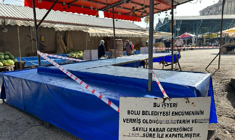 Bolu’nun en büyük pazar alanında Zabıta Müdürlüğü Pazarlar Şube Amirliği ekipleri denetim gerçekleştirdi. Esnafların açmış olduğu tezgahlar tek tek kontrol edildi. Yapılan denetimler çerçevesinde ekipler, pazar kurallarına uymadığını tespit ettikleri bir esnafın tezgahını mühürledi. 7 gün ceza verilen esnaf bir hafta boyunca tezgahını açamayacak.